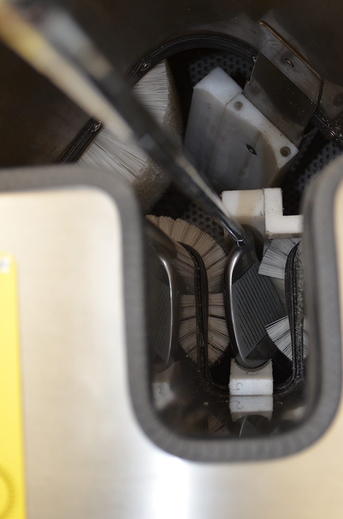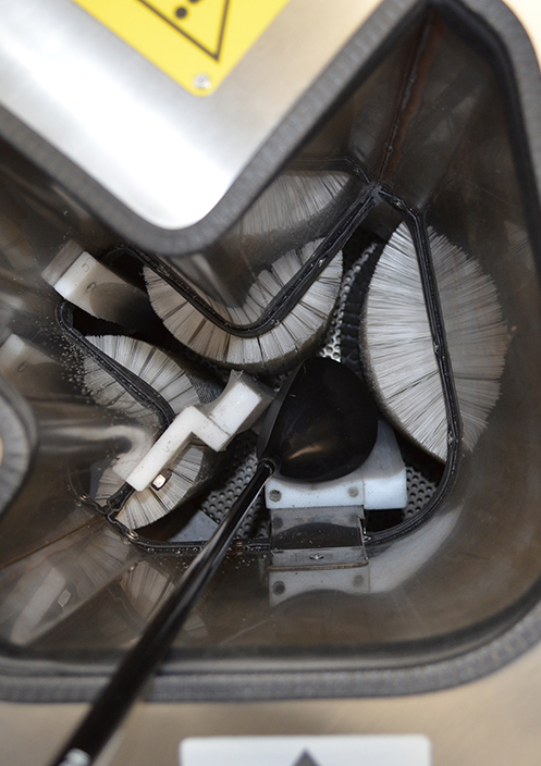 La macchina è stata disegnata con le spazzole poste sul fondo della macchina così da evitare eventuali sgradevoli schizzi prodotti durante l’operazione di lavaggio.